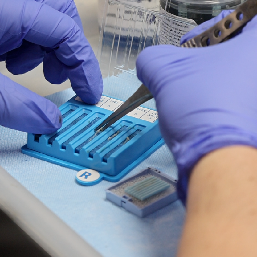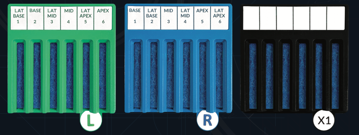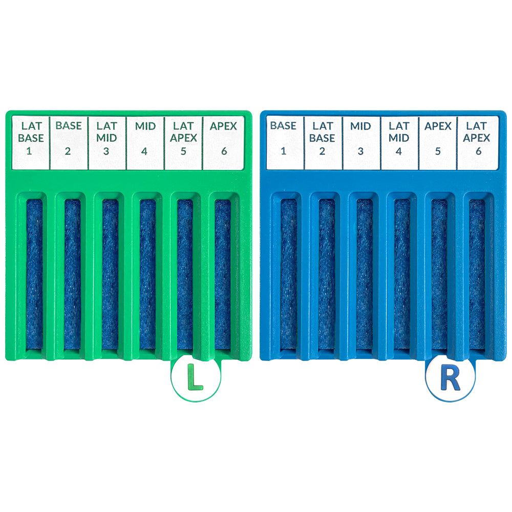 Lumea sells a 6-core BxBoard, ideal for small needle-core biopsies like prostate. It holds 18-20 gauge tissue cores. A typical 12-core prostate sampling would require two 6-lane BxBoards, instead of 12 jars/labels.